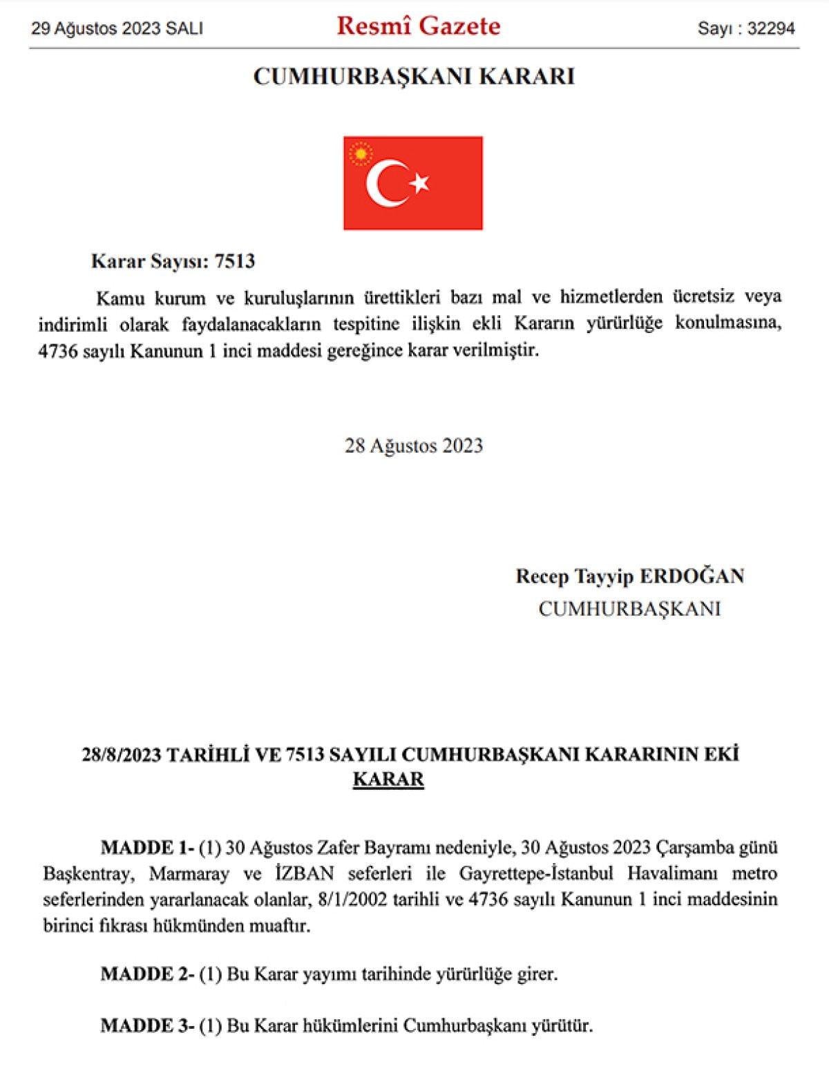 Buna göre Marmaray, Başkentray, İZBAN ve Gayrettepe-İstanbul Havalimanı Metrosu seferleri 30 Ağustos'ta ücretsiz olacak.
