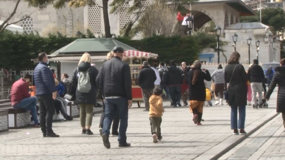 Hafta sonu uygulanan sokağa çıkma kısıtlamasından muaf olan turistler ise güneşi fırsat bilerek meydanlara akın etti.