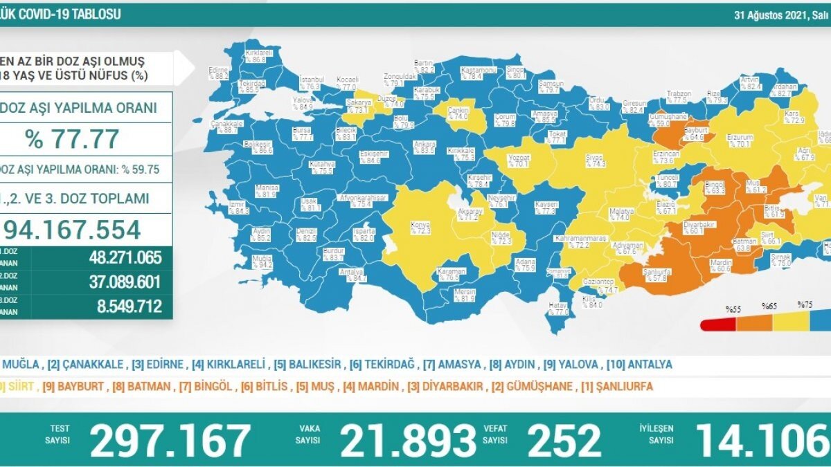 Buna göre; Türkiye'de son 24 saatte 297 bin 167 Kovid-19 testi yapıldı, 21 bin 893 kişinin testi pozitif çıktı, 252 kişi hayatını kaybetti.