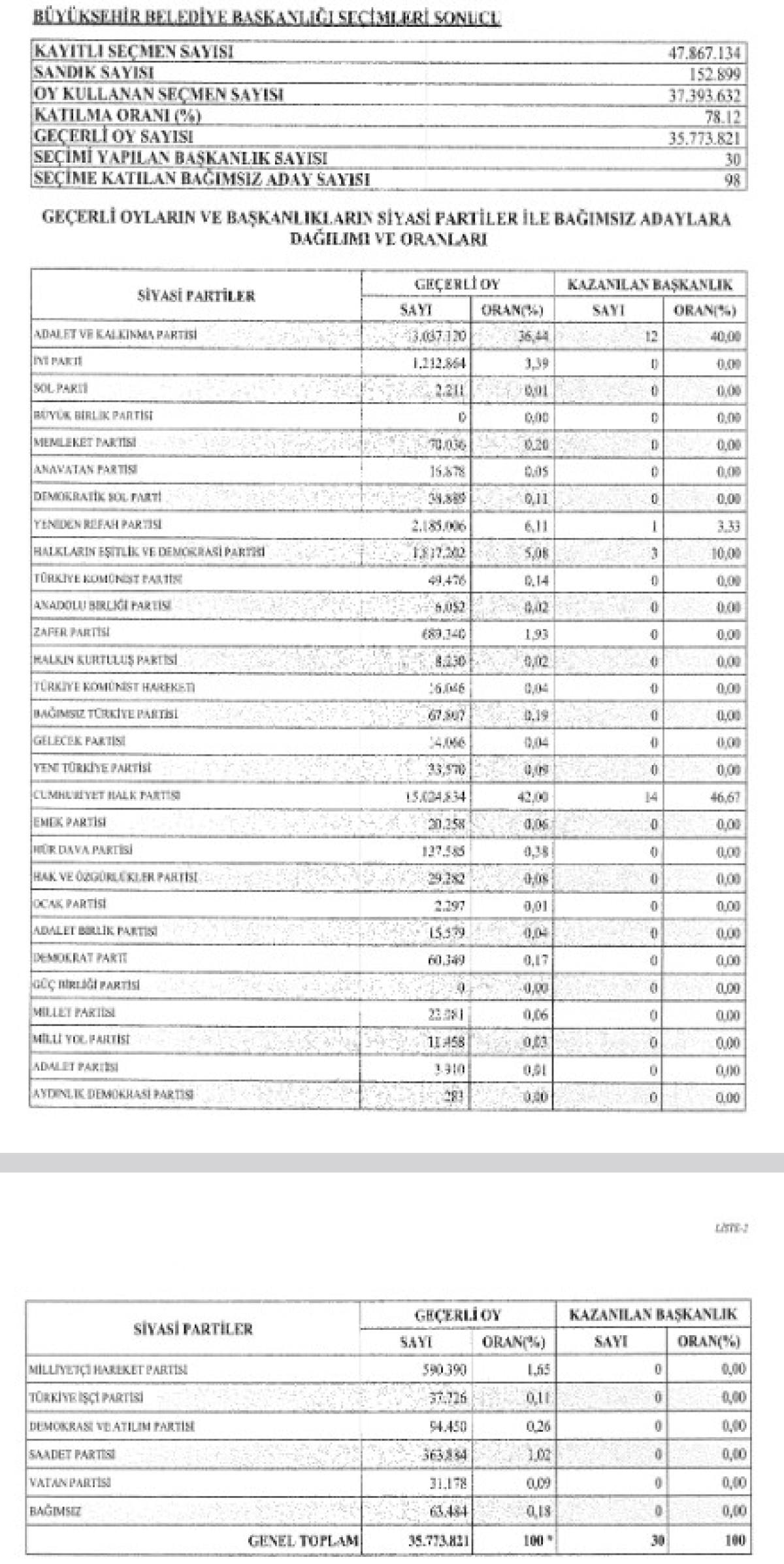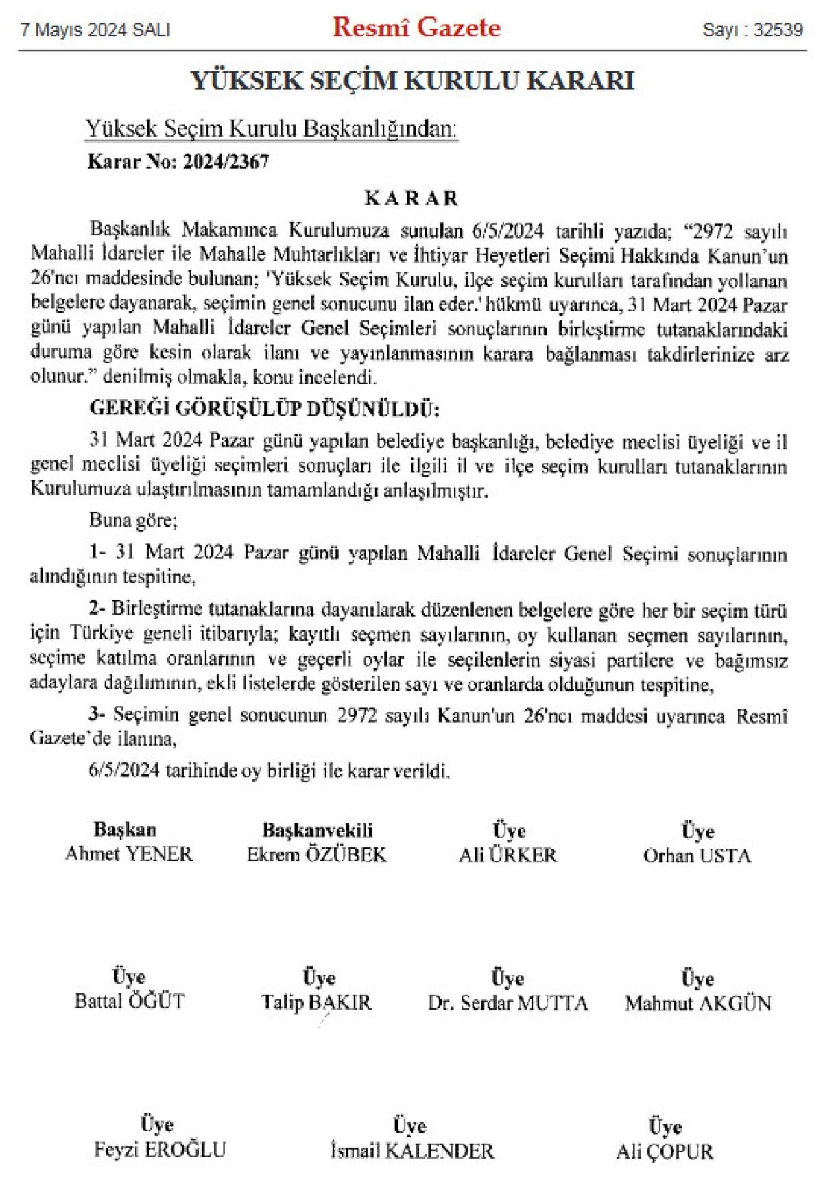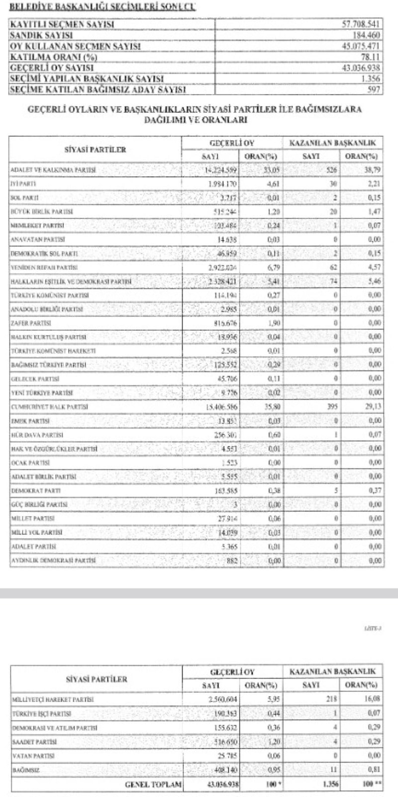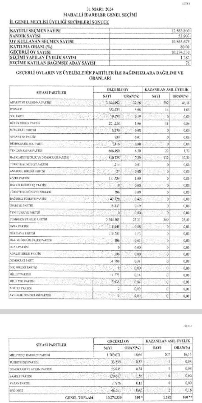 Yüksek Seçim Kurulu'nun 31 Mart'ta gerçekleştirilen yerel seçimlerin nihai sonuçları, bugün Resmi Gazete'de yayınlanan bir karar ile kamuoyuna duyuruldu.