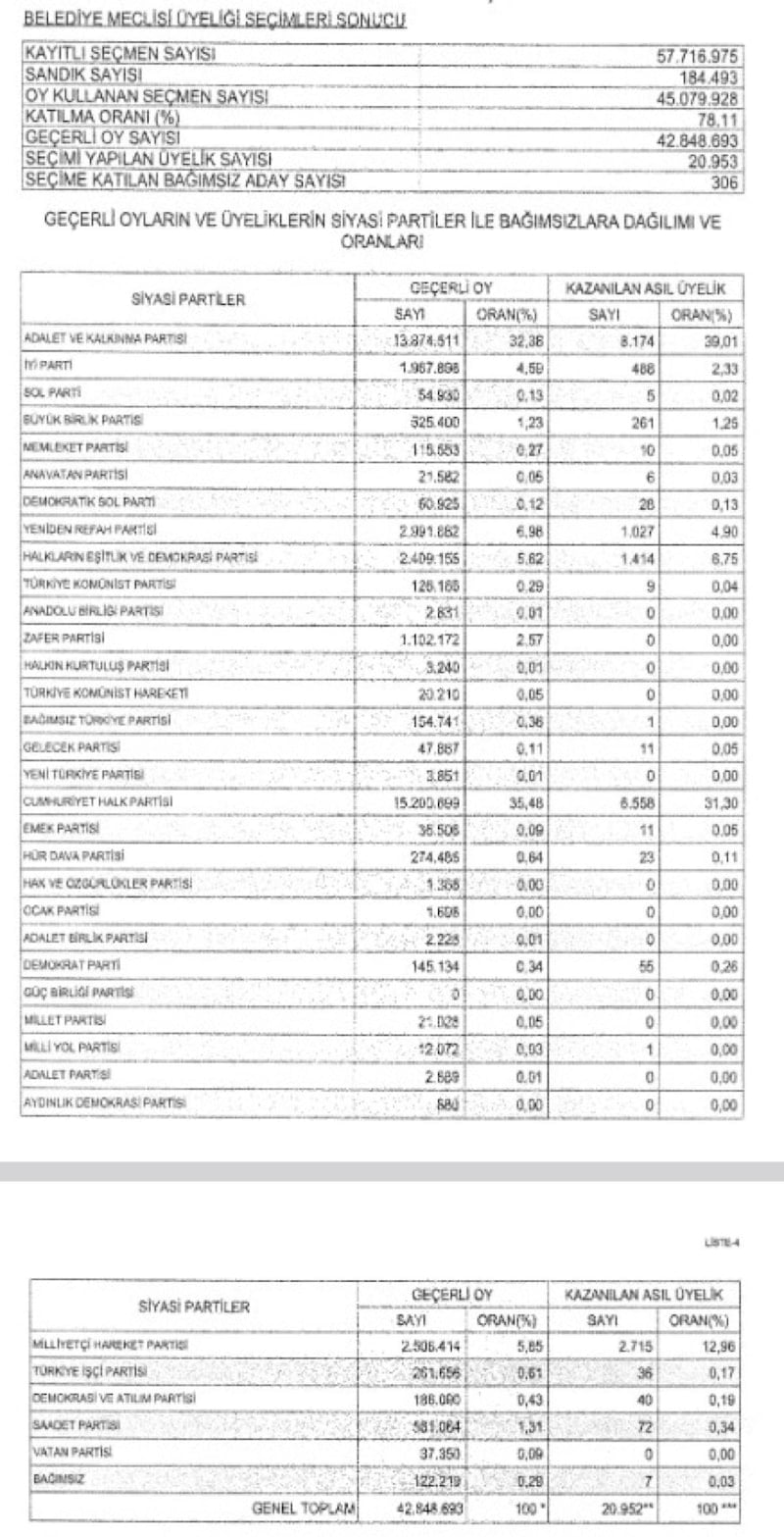 Yayınlanan kararda; büyükşehir ve ilçe belediye başkanlıkları, İl Genel Meclisi ve Belediye Meclisi üyelikleri için yapılan seçimlerdeki katılım oranları ve siyasi partilerin aldığı oy yüzdelerine detaylı olarak yer verildi.