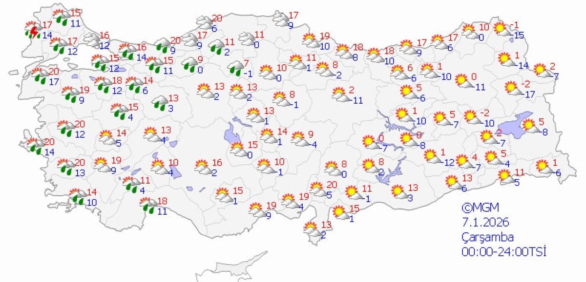 Hava durumuna ilişkin değerlendirmede bulunan Çevre, Şehircilik ve İklim Değişikliği Bakanlığı Meteoroloji Genel Müdürlüğü Hava Tahmin Uzmanı Cengiz Çelik, çarşamba günü yurdun batı bölgelerinde kuvvetli lodosla birlikte sağanak geçişleri görüleceğini bildirdi.