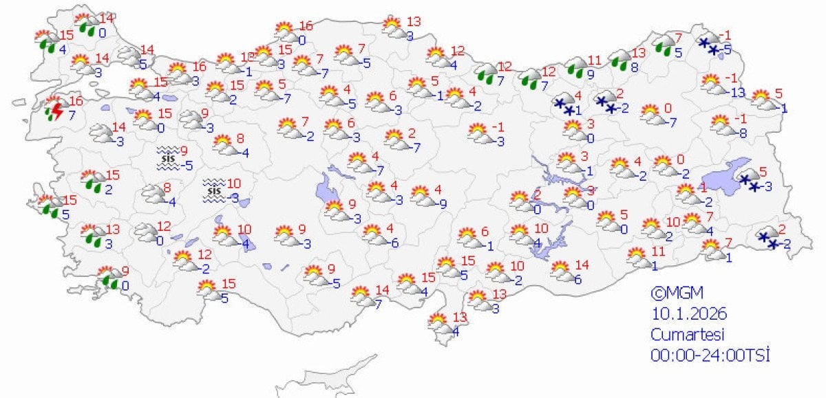- Trakya, Ege, Marmara, Doğu Karadeniz, Doğu ve Güneydoğu Anadolu'da sağanak, fırtına ve çığ tehlikesi bekleniyor.