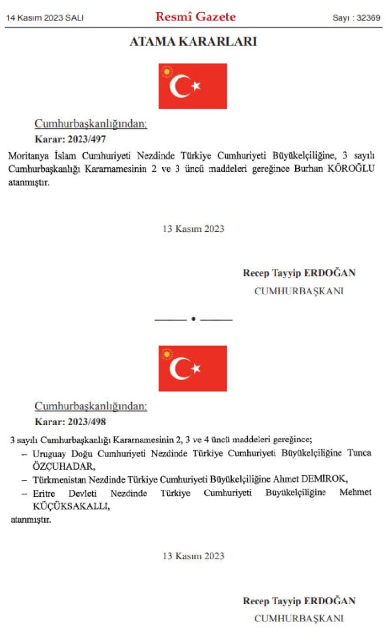 Cumhurbaşkanı Recep Tayyip Erdoğan'ın imzasıyla, Dışişleri Bakanlığınca yapılan büyükelçi atama kararları, Resmi Gazete'de yayınlandı.