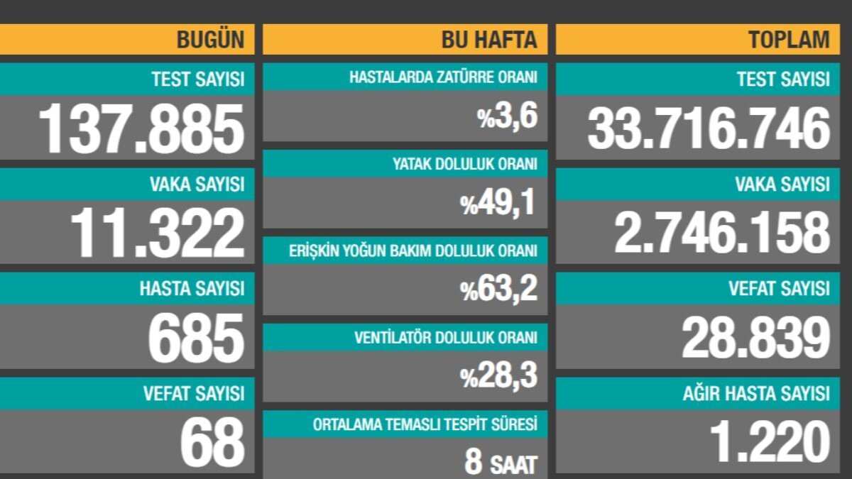 Bugünkü tabloya göre, son 24 saat içerisinde 137 bin 885 kişiye koronavirüs testi yapıldı. Böylelikle yapılan toplam test sayısı 33 milyon 716 bin 746'ya ulaştı.