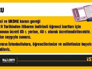 İstanbul Büyükşehir Belediye Meclisi, aylık öğrenci toplu taşıma kartı 'akbil' ücretinin 85 liradan 40 liraya indirilmesini oy birliğiyle kabul etti.