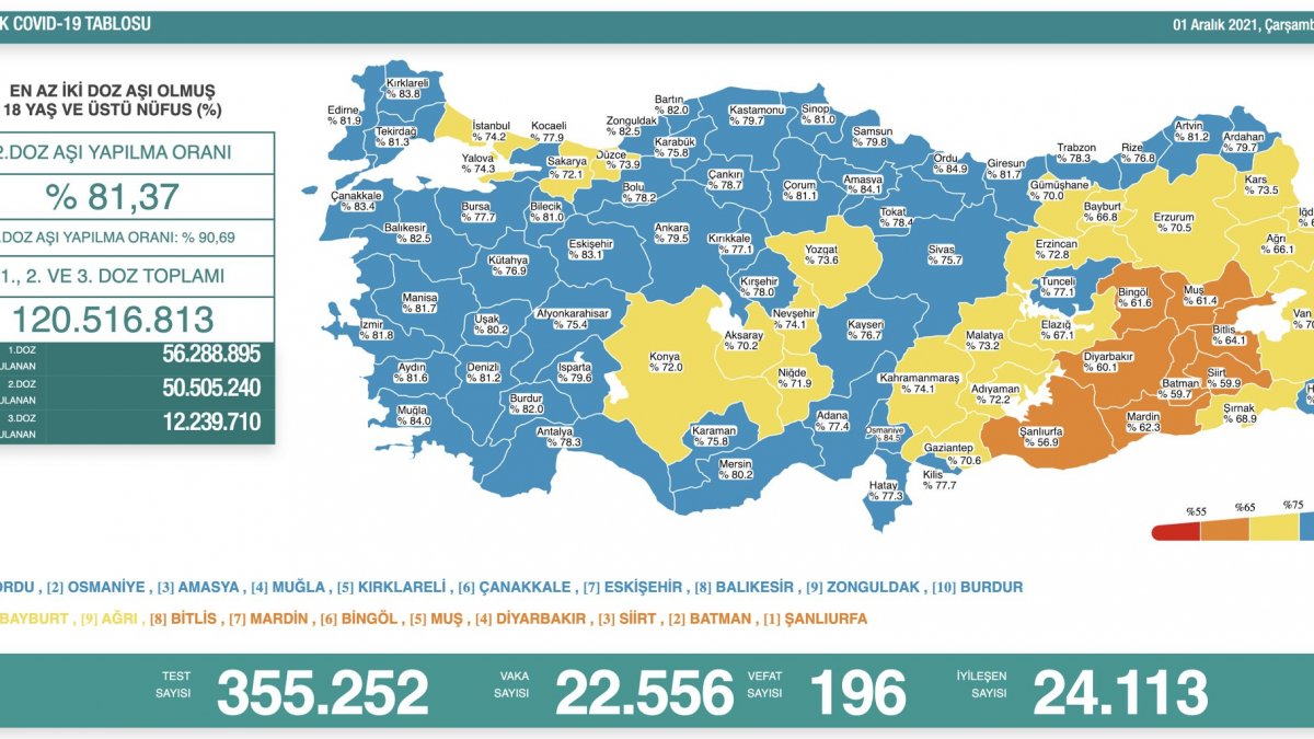 Buna göre; Türkiye'de son 24 saatte 355 bin 252 Kovid-19 testi yapıldı, 22 bin 556 kişinin testi pozitif çıkarken, 196 kişi ise hayatını kaybetti.