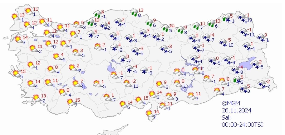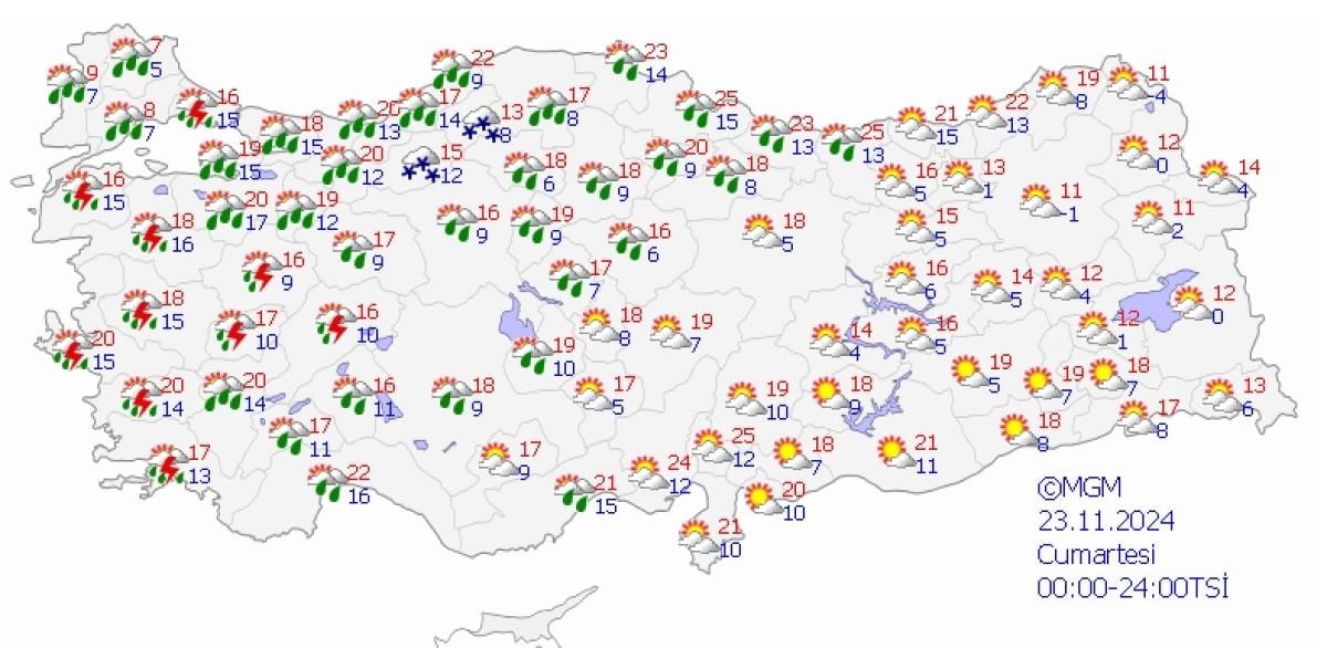 Afyonkarahisar, Amasya, Ankara, Antalya, Aydın, Balıkesir, Bilecik, Bursa, Çanakkale, Çankırı, Çorum, Denizli, Edirne, Eskişehir, İstanbul, İzmir, Kayseri, Kırklareli, Kırşehir, Kocaeli, Konya, Kütahya, Manisa, Muğla, Nevşehir, Niğde, Sakarya, Samsun, Sinop, Sivas, Tekirdağ, Tokat, Uşak, Yozgat, Aksaray, Karaman, Kırıkkale, Yalova illerinde 'sarı' uyarı verilirken Bolu, Kastamonu, Zonguldak, Bartın, Karabük, Düzce'ye ise 'turuncu' uyarı verildi.