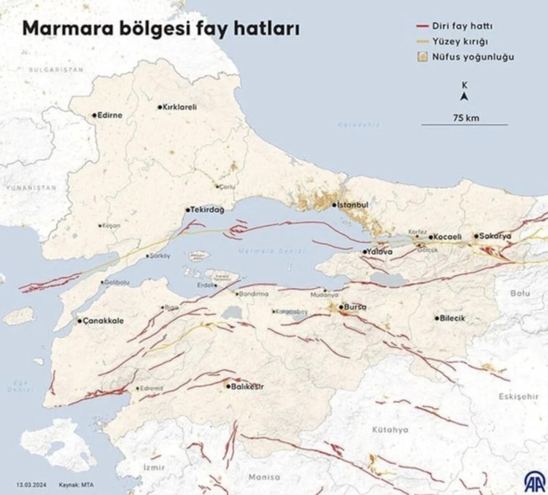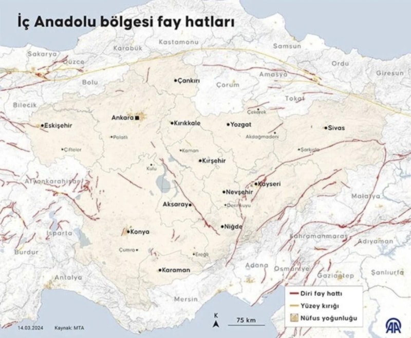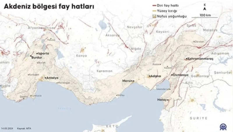 Maden Tetkik Arama Genel Müdürlüğü de (MTA), yaptığı güncellemeyle Türkiye genelindeki diri fay hattı haritasını yayınladı. Bu haritaya göre, Türkiye’de 485 diri fay tespit edildi. Bu faylar, 45 il ve 110 ilçeyi kapsayacak şekilde geniş bir alanı etkileyebilir.