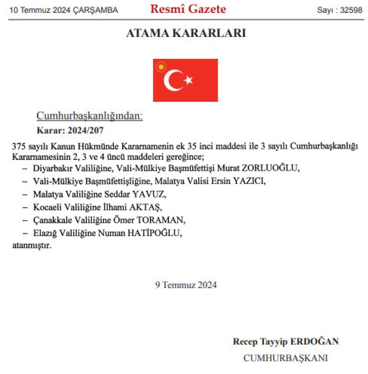 Diyarbakır Valiliğine Murat Zorluoğlu, Malatya Valiliğine Seddar Yavuz, Kocaeli Valiliğine İlhami Aktaş, Çanakkale Valiliğine Ömer Toraman, Elazığ Valiliğine ise Numan Hatipoğlu atandı.