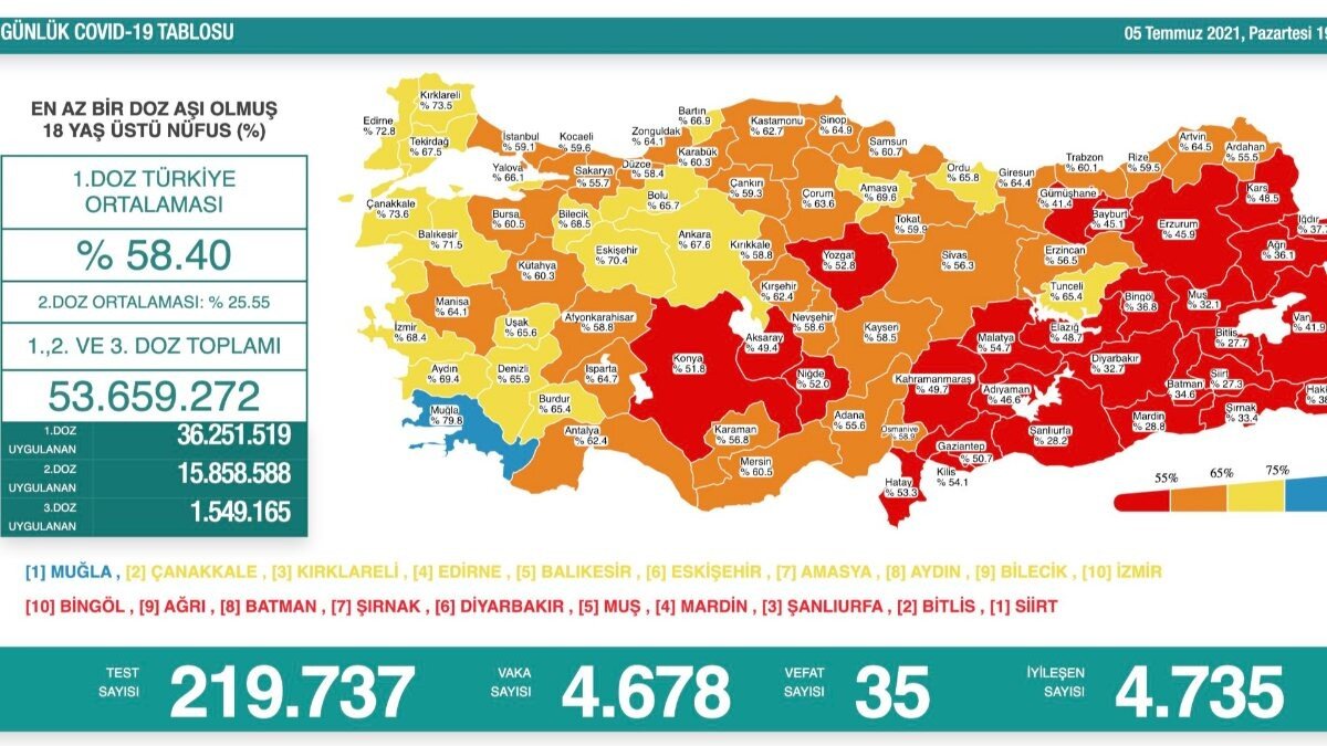 Bakan Koca'nın paylaştığı tabloya göre ülke genelinde toplamda uygulanan 1. doz aşı miktarı 36 milyonu geçti.