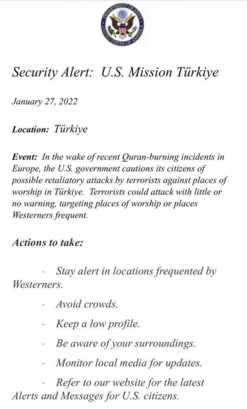 Avrupa’da son zamanlarda yaşanan Kur’an yakma olaylarının ardından ABD hükümeti, vatandaşlarını teröristlerin Türkiye’deki ibadethanelere olası misilleme saldırılarına karşı uyarıyor. Teöristler, inadet yerlerini veya Batılıların sık sık ziyaret ettiği yerleri hedef alarak, çok az uyarıda bulunarak veya hiç uyarı vermeden saldırabilirler.