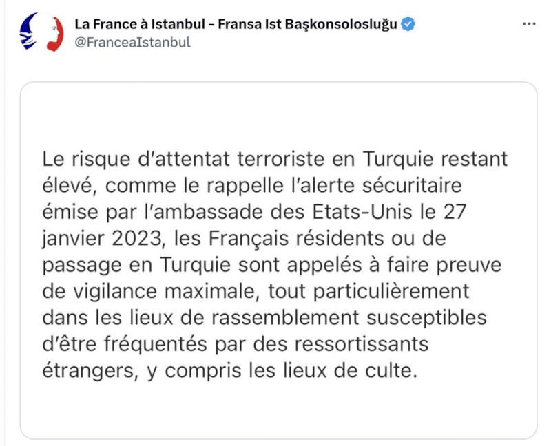 ABD Konsolosluğu’nun 27 Ocak 2023’te yayımladığı güvenlik uyarısında hatırlatıldığı üzere, Türkiye’de terör saldırısı riski arttığından Türkiye’de ikamet eden ya da Türkiye'den geçmekte olan Fransızlar ibadet yerleri de dahil olmak üzere özellikle yabancı uyruklular tarafından ziyaret edildiği biline buluşma noktalarında azami dikkat göstermeye çağrılmaktadır.