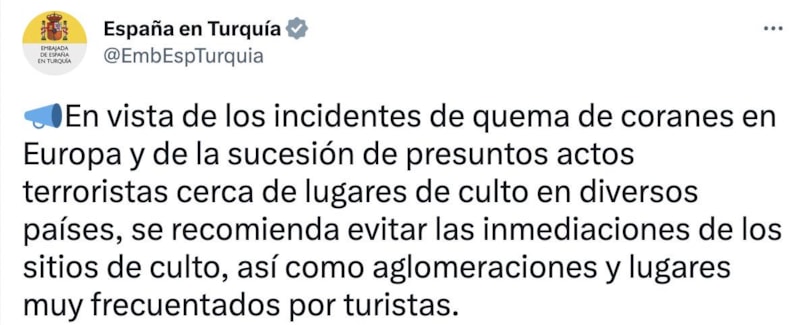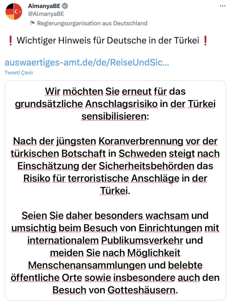 Kısa bir süre öce İsveç’te Türk Büyükelçiliği önünde Kur’an-ı Kerim’in yakılması Türkiye’de terör saldırıları riskini artırmıştır. Bu nedenle özellikle yoğun, kalabalık kamusal yerlerde bulunmakta kaçınılmalı ve dini ibadet yerlerini ziyaret ederken dikkatli olunmalıdır.