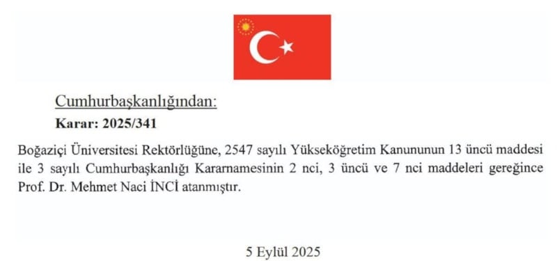 Resmi Gazete kararıyla, Boğaziçi Üniversitesi Rektörlüğüne, Prof. Dr. Mehmet Naci İnci yeniden atanmış oldu.