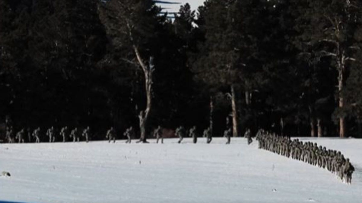 Videoda binlerce askerin kar üstünde yürüdüğü görüldü.