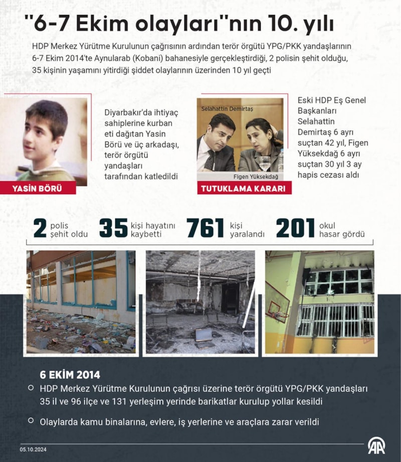 HDP Merkez Yürütme Kurulu'nun çağrısının ardından terör örgütü YPG/PKK yandaşlarının 6-7 Ekim 2014'te Aynularab (Kobani) bahanesiyle gerçekleştirdiği, 2 polisin şehit olduğu, 35 kişinin yaşamını yitirdiği şiddet olaylarının üzerinden 10 yıl geçti.