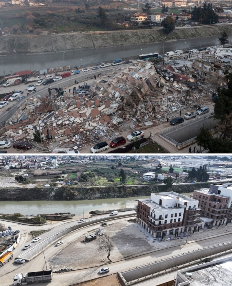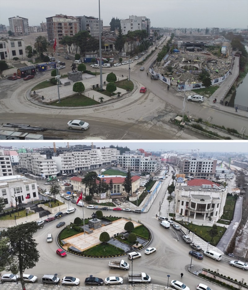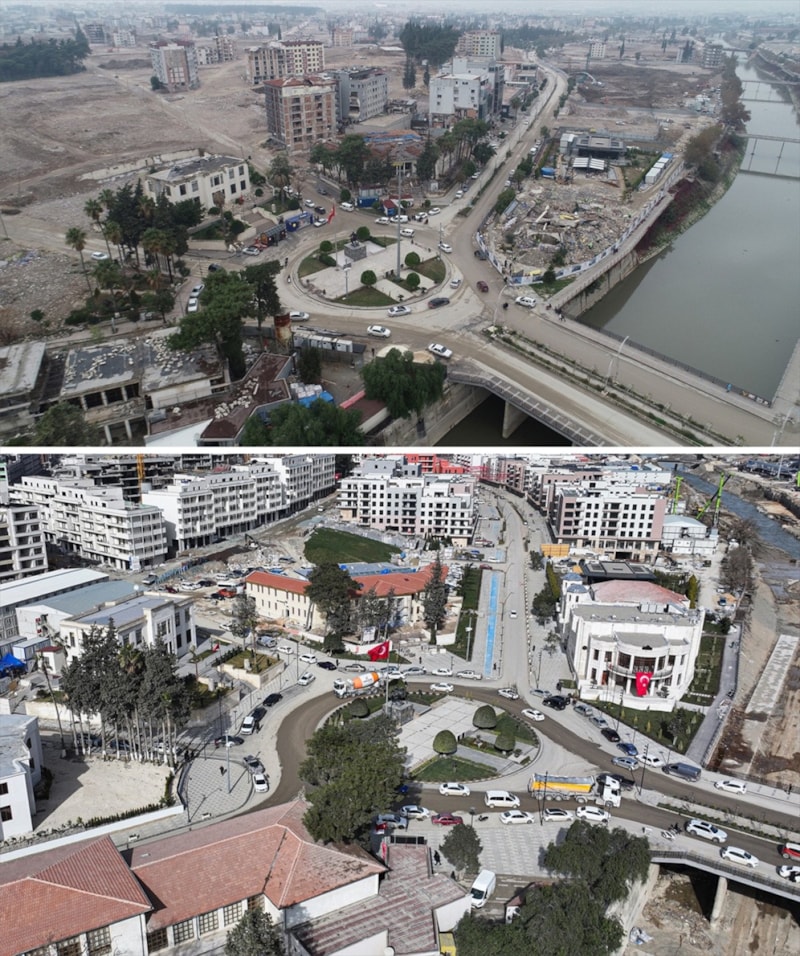 6 Şubat 2023 depremlerinde büyük yıkım yaşayan Hatay’da, afetin üçüncü yılında geçmiş ve bugün aynı açılardan drone'la görüntülendi.