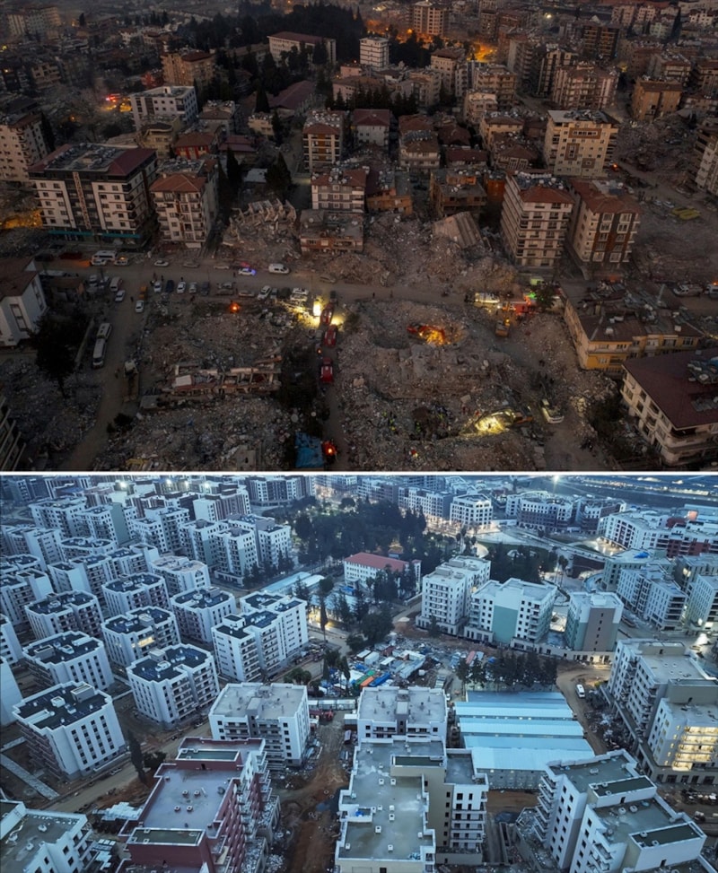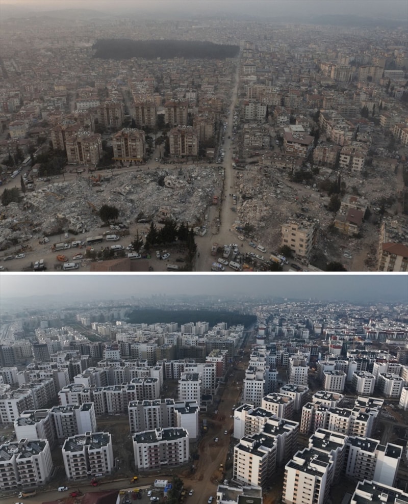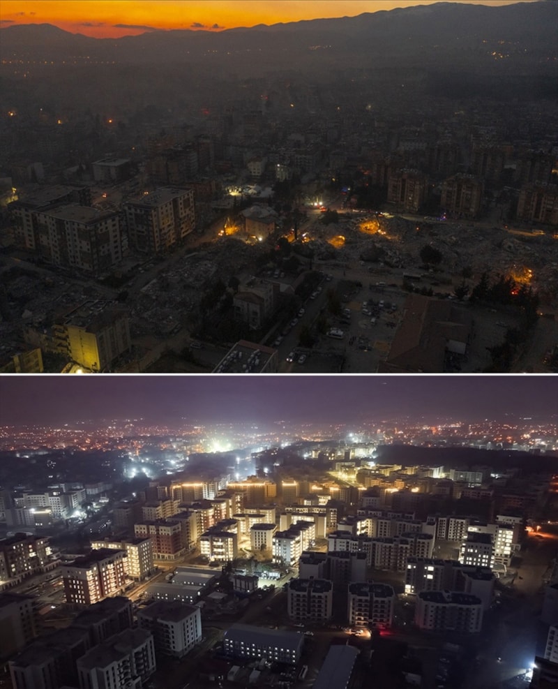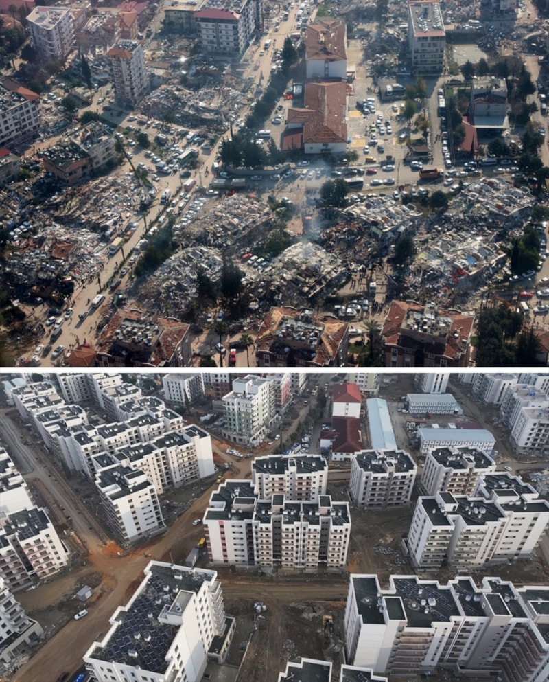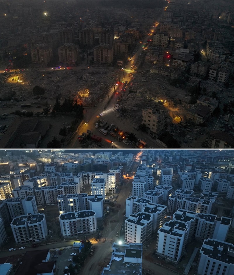 Ortaya çıkan kareler, 2023’te enkaz haline gelen alanların yerinde yükselen yeni yapıları ve şehir genelinde yürütülen kapsamlı inşa çalışmalarını ortaya koydu.