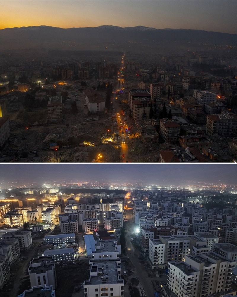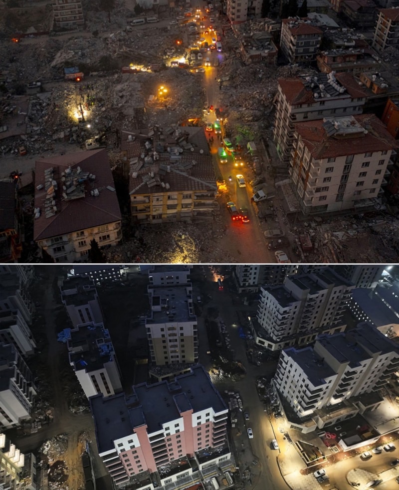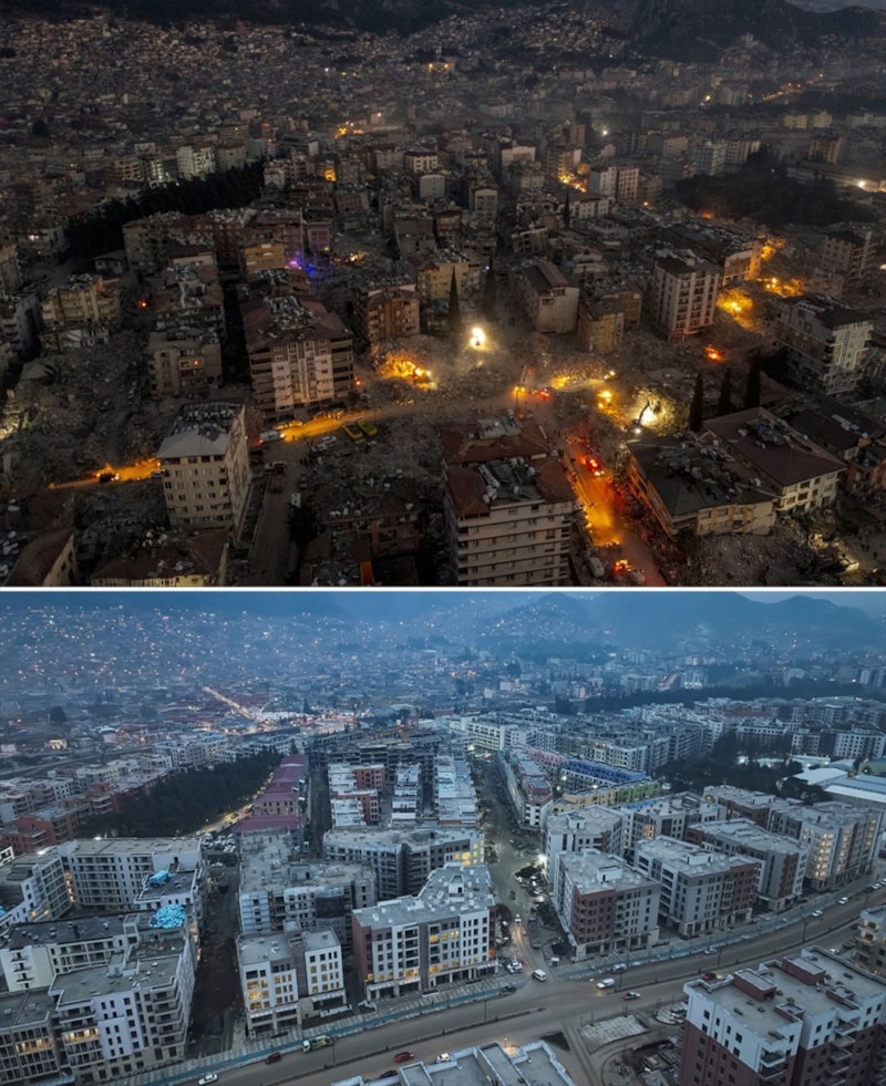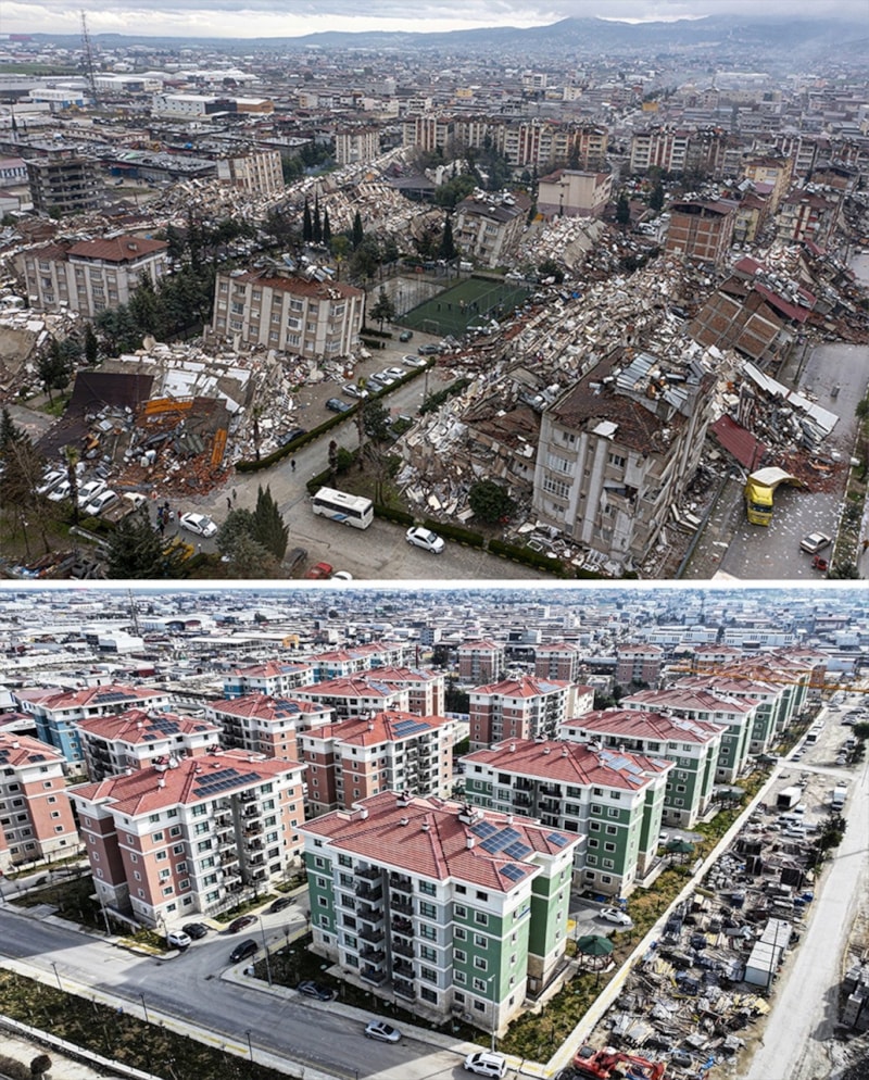 Ortaya çıkan kareler, 2023’te enkaz haline gelen alanların yerinde yükselen yeni yapıları ve şehir genelinde yürütülen kapsamlı inşa çalışmalarını ortaya koydu.