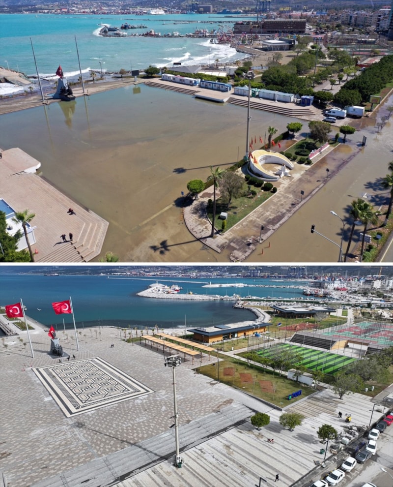 Depremlerle yaklaşık 80 santimetre çökmenin meydana geldiği İskenderun sahil bandı da yenilenen haliyle görüntülendi. Üç yıl arayla kaydedilen görüntüler, Çevre, Şehircilik ve İklim Değişikliği Bakanlığı tarafından düzenlenen sahil bandının sosyal donatılarla yeniden canlandırıldığını gösterdi.