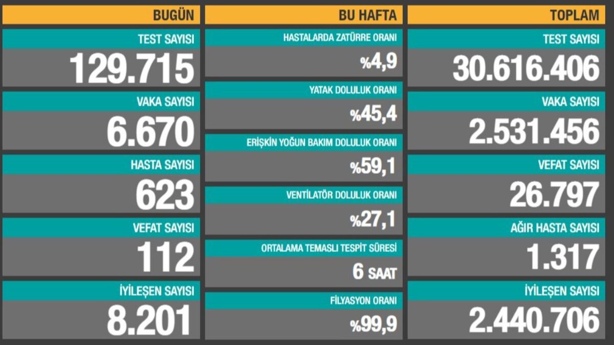 Tedavi altındaki 8 bin 201 kişi iyileşerek sağlığına kavuşurken 112 kişi daha virüse yenilerek yaşamını yitirdi.