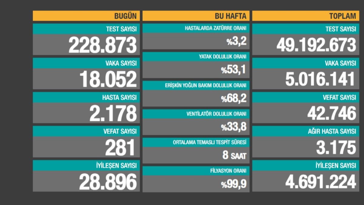 Bakanlığın paylaştığı tabloya göre bugün yapılan testler sonucu 18 bin 52 yeni vaka tespit edildi.