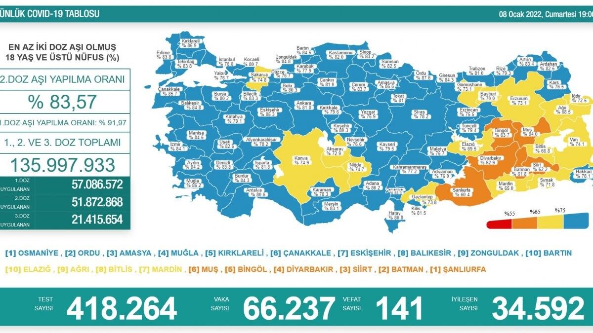 Buna göre; Türkiye'de son 24 saatte 418 bin 264 Kovid-19 testi yapıldı, 66 bin 237 kişinin testi pozitif çıkarken, 141 kişi ise hayatını kaybetti.