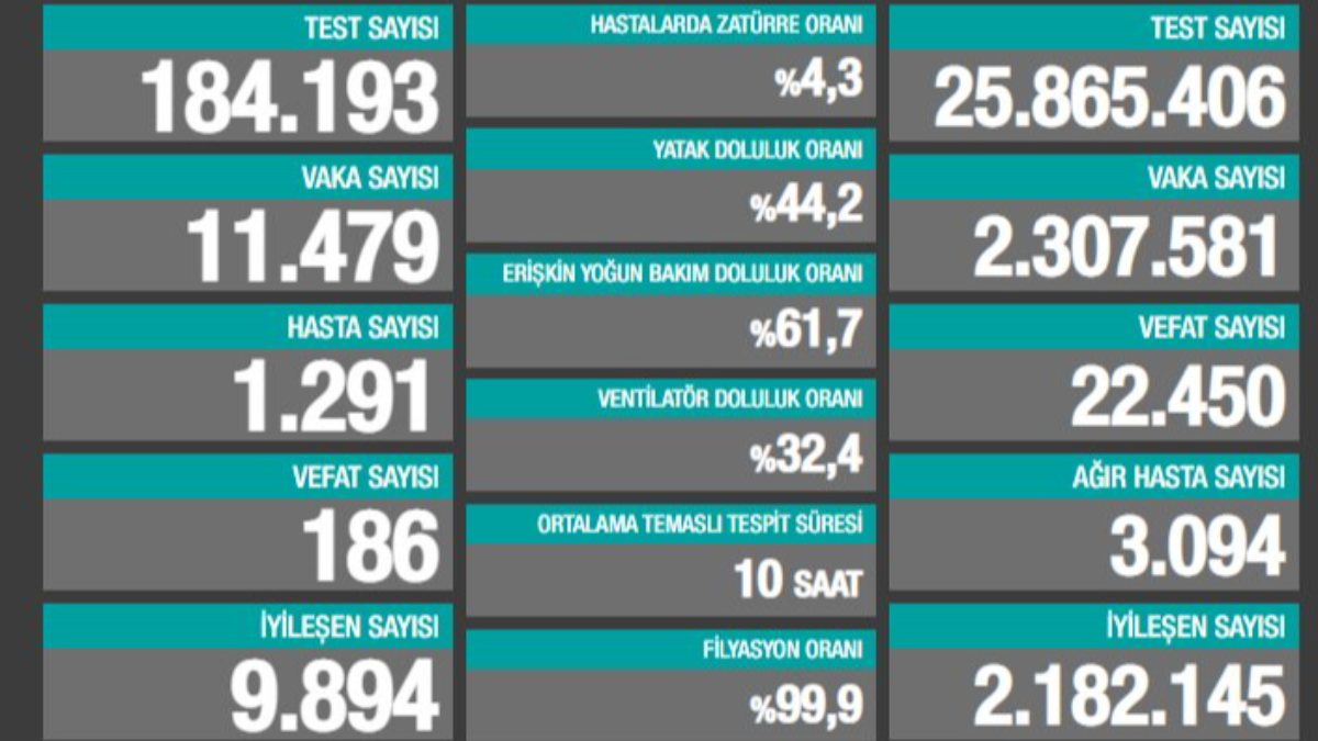 "Bugün tespit edilen 1291 yeni hastamız var. Ağır hasta sayımız azalmaya devam ediyor. Hastane yükümüz umut verici şekilde azalıyor. Vaka sayılarındaki düşüşü kalıcı kılmak elimizde. Kısıtlama ve tedbirlere tam olarak uyalım. Birlik olup kazanacağız."