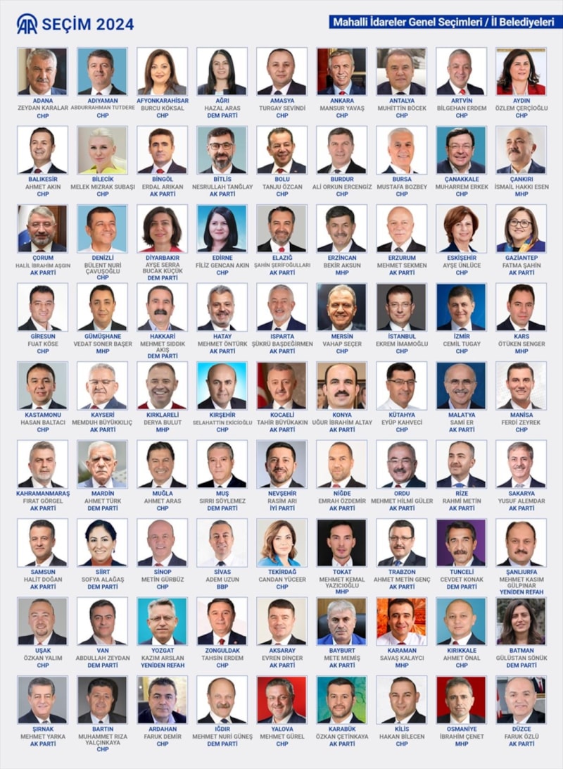 31 Mart Mahalli İdareler Genel Seçimleri'nin sonuçlarına göre yeni dönemde belediye başkanlığını kazanan adaylar.