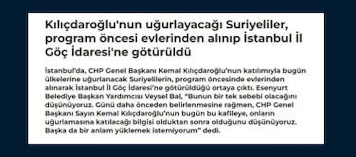 Bazı basın yayın organlarında, "Suriyelileri CHP'den kaçırdılar" başlıklı haberlerde geçen, "Esenyurt Belediyesinin geri dönüş programına Kemal Kılıçdaroğlu'nun da katılacağı ortaya çıkınca, Suriyelileri İl Göç İdaresine götürdüler" iddiasının doğru olmadığı kaydedilen bültende, şunlar ifade edildi: