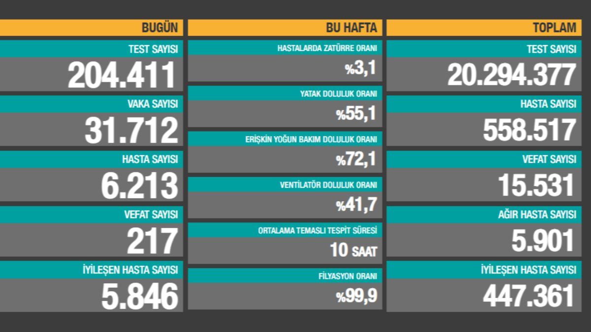 Tedavi altındaki 5 bin 846 kişi sağlığına kavuşurken 217 kişi hayatını kaybetti. Hayatını kaybedenlerin sayısı 15 bin 531 oldu.