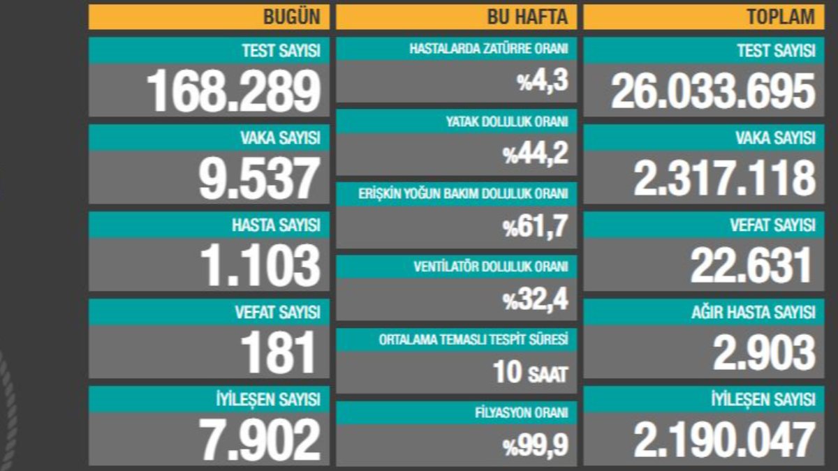 Bugünkü tabloya göre, yapılan testler sonucu 9 bin 537 kişinin virüse yakalandığı belirlendi.