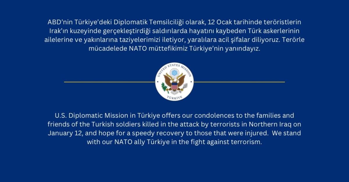 ABD’nin Türkiye’deki Diplomatik Temsilciliği olarak, 12 Ocak tarihinde teröristlerin Irak’ın kuzeyinde gerçekleştirdiği saldırılarda hayatını kaybeden Türk askerlerinin ailelerine ve yakınlarına taziyelerimizi iletiyor, yaralılara acil şifalar diliyoruz. Terörle mücadelede NATO müttefikimiz Türkiye’nin yanındayız.