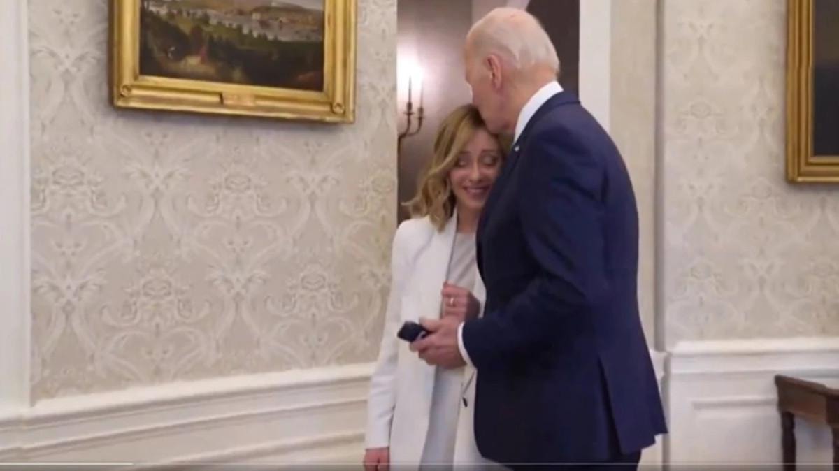 Meloni'yi ayakta karşılayan Biden, ayaküstü sohbet sırasında saçlarından öptü.