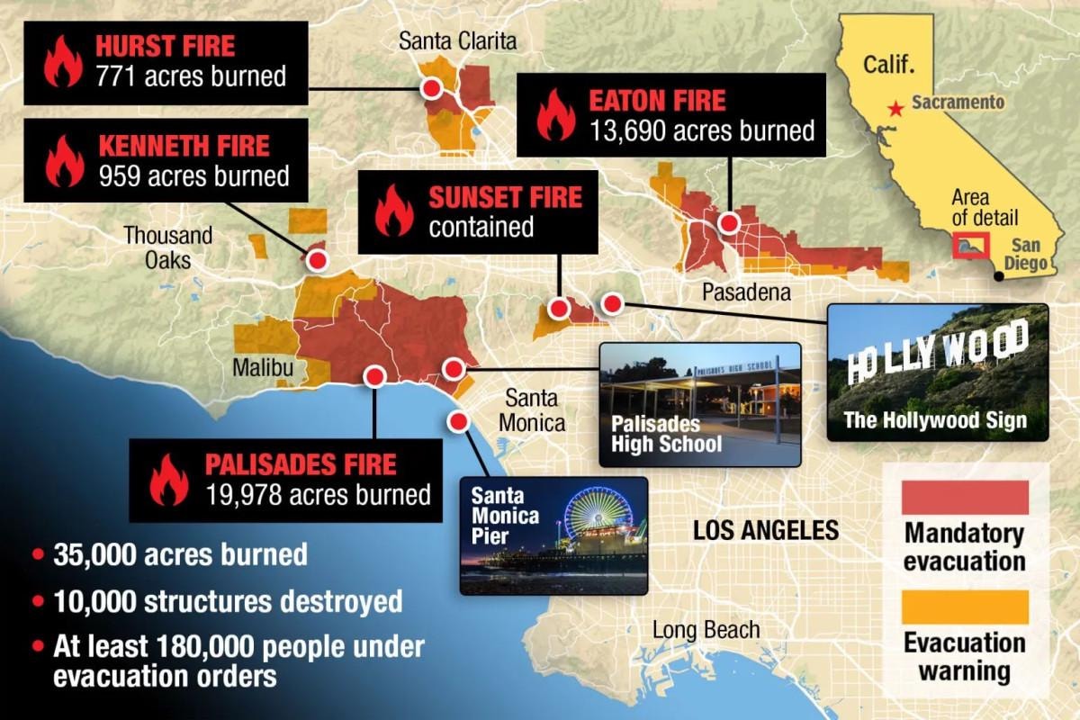 20 bin dönümden fazla alanı küle çeviren Palisades yangınının yüzde 8 oranında, 14 bin dönümden fazla alanı küle çeviren Eaton yangınının yüzde 3 oranında kontrol altına alınabildiği belirtilirken, etkilenen tüm bölgelere ulaşılmasıyla ölü sayısının artmasının beklendiği bildirildi.