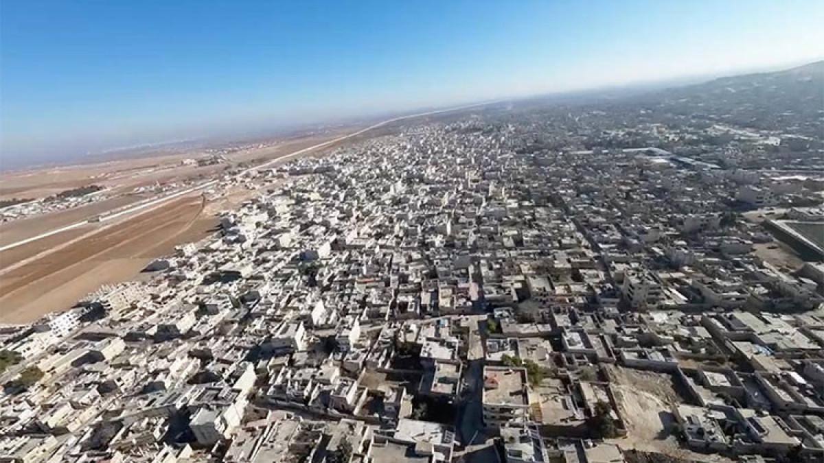 AA'nın ön cepheden yerden de görüntülediği bina, caddeye sıfır noktada yer alırken, Türkiye sınırına yalnızca bir kilometre uzaklıkta bulunuyor.