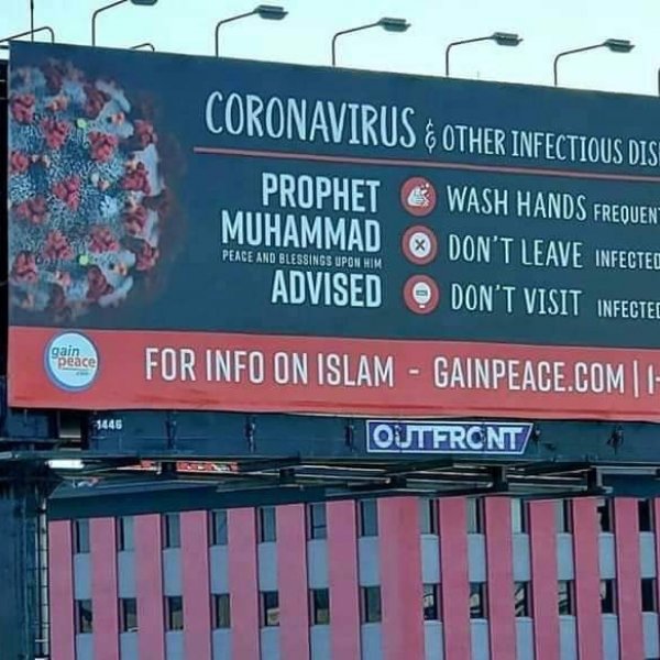 ABD’nin Chicago kentinde bir reklam panosunda, Hz. Muhammed’in salgın hastalıklar ile ilgili hadisine atıfta bulunarak, Hz. Muhammed’in "Bir yerde veba ve benzeri, herhangi bir bulaşıcı hastalık olduğunu işittiğiniz zaman, o yere girmeyiniz. Bulunduğunuz yerde böyle bulaşıcı bir hastalık varsa, oradan da çıkıp kaçmayınız." hadisi, koronavirüs salgınına karşı kullanıldı.
