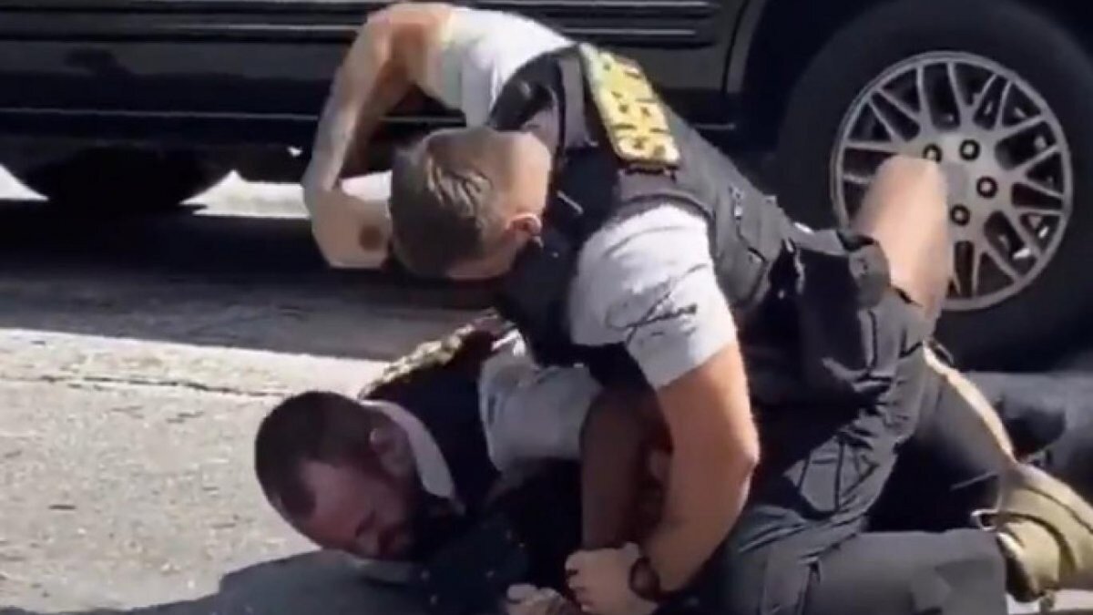 İki polisten biri Walker'ın boğazına bastırıp onu yerde tutarken, diğeri de vücuduna ve yüzüne yumruk atıyor.
