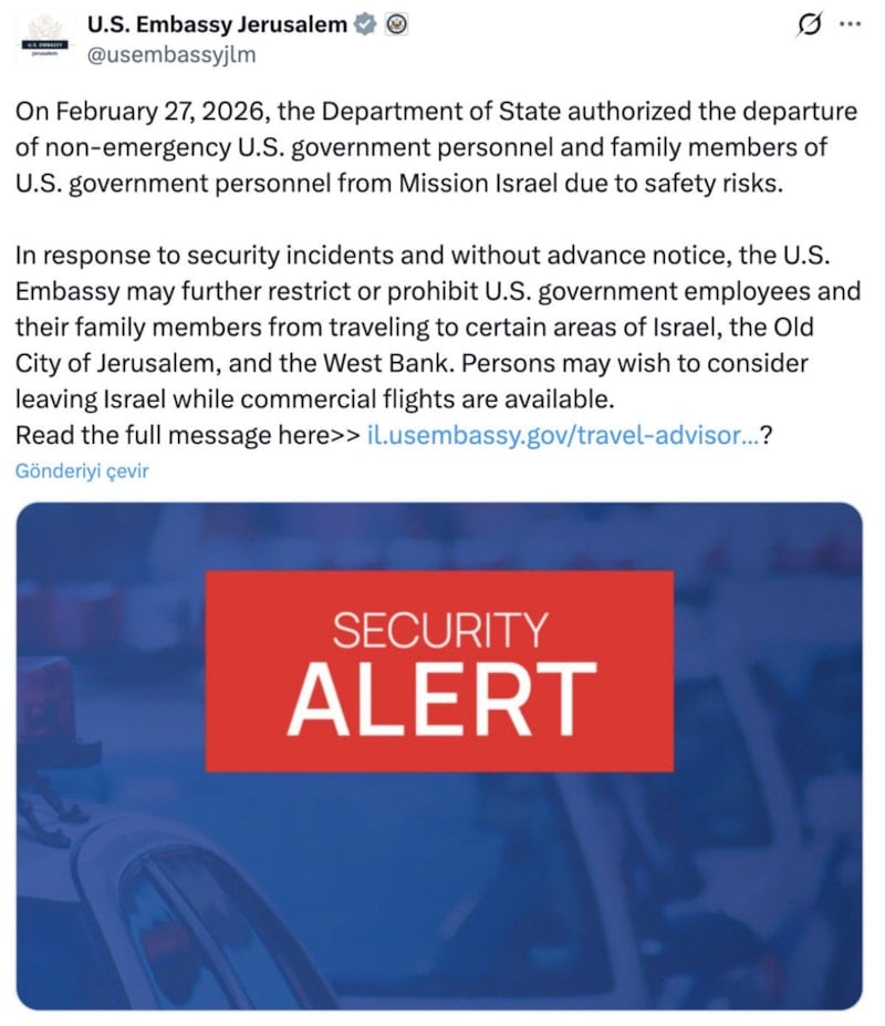 Açıklamada, "27 Şubat 2026 tarihinde, Dışişleri Bakanlığı, güvenlik riskleri nedeniyle acil durum dışı ABD hükümeti personeli ve personelin aile üyelerinin İsrail Misyonu'ndan ayrılmasına izin vermiştir." ifadelerine yer verildi.