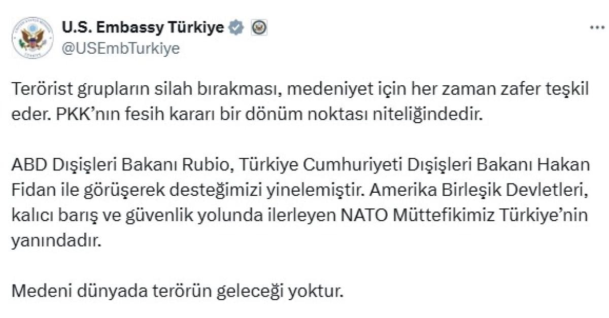 ABD Türkiye Büyükelçiliğinin sosyal medya hesabından yapılan açıklamada, "Terörist grupların silah bırakması, medeniyet için her zaman zafer teşkil eder. PKK’nın fesih kararı bir dönüm noktası niteliğindedir." denildi.