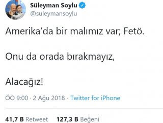 Soylu, sosyal medyadan yaptığı paylaşımda "Amerika'da bir malımız var; Fetö. Onu da orada bırakmayız, alacağız!" açıklamasını yapmıştı.