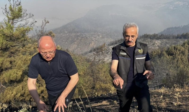 Ulaştırma ve Altyapı Bakanı Abdulkadir Uraloğlu, Yangın Harekat Merkezi'nde, bölgede devam eden çalışmalar ve son durumla ilgili Vali Erol Ayyıldız ve Orman Bölge Müdürü Erdal Şahan'dan son bilgileri aldıktan sonra helikopterle yangın bölgesinde havadan incelemelerde bulundu.