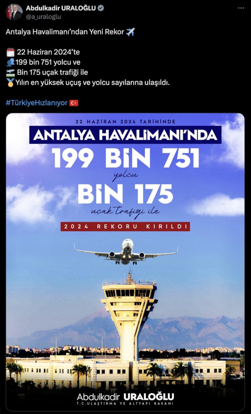 "Antalya Havalimanı’ndan yeni rekor... 22 Haziran 2024’te 199 bin 751 yolcu ve bin 175 uçak trafiği ile yılın en yüksek uçuş ve yolcu sayılarına ulaşıldı."