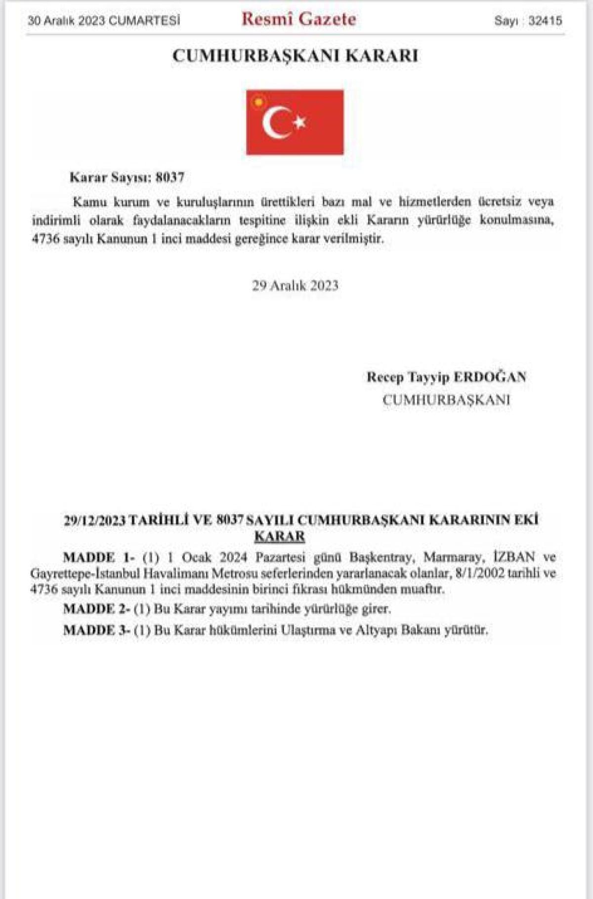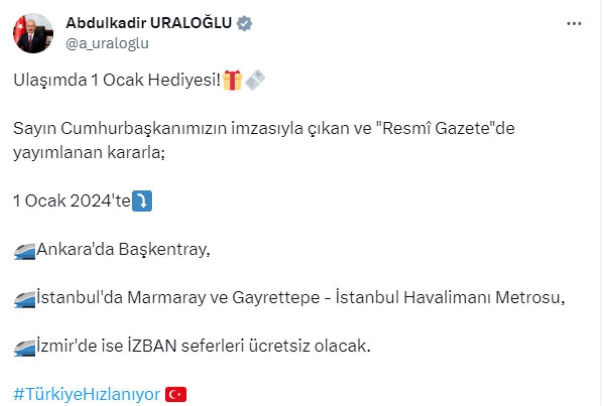 Sayın Cumhurbaşkanımızın imzasıyla çıkan ve "Resmî Gazete"de yayımlanan kararla; 1 Ocak 2024'te Ankara'da Başkentray, İstanbul'da Marmaray ve Gayrettepe - İstanbul Havalimanı Metrosu, İzmir'de ise İZBAN seferleri ücretsiz olacak.