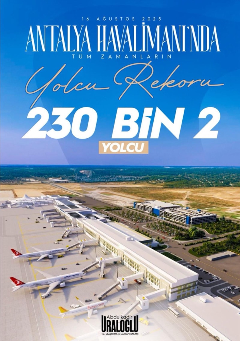 Bakan Uraloğlu, yaptığı paylaşımda Antalya Havalimanı'nda 16 Ağustos 2025’te tüm zamanların yolcu rekoru kırıldığını duyurdu.