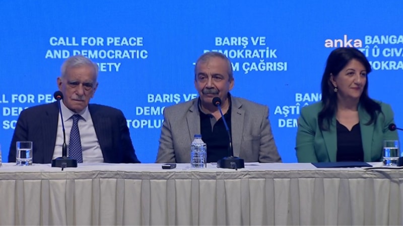 DEM Parti İmralı Heyeti'nin Abdullah Öcalan'ın çağrısını paylaşacağı toplantı salonuna zılgıtlarla giriş yaptığı anlar kameralara yansıdı.