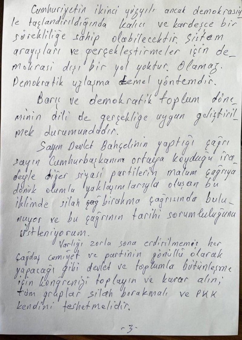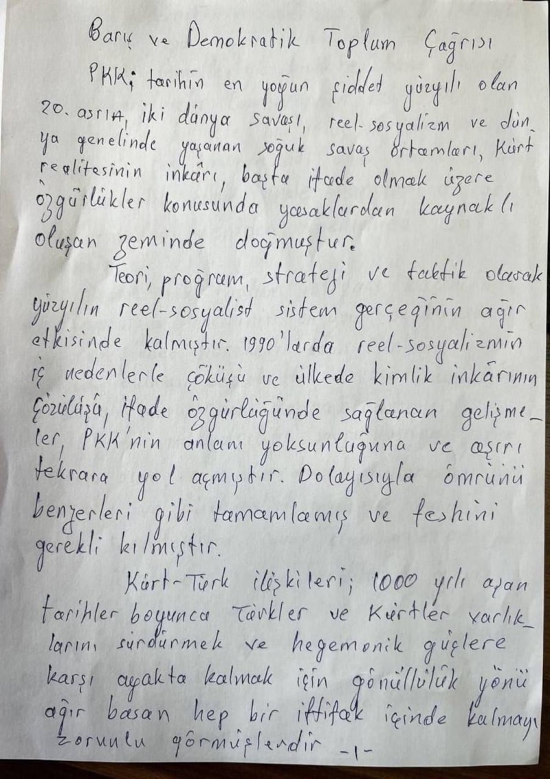 Görüşme sonrası İstanbul'a dönen heyet, Öcalan’ın kendi yazdığı bildirisini kamuoyuna sundu.