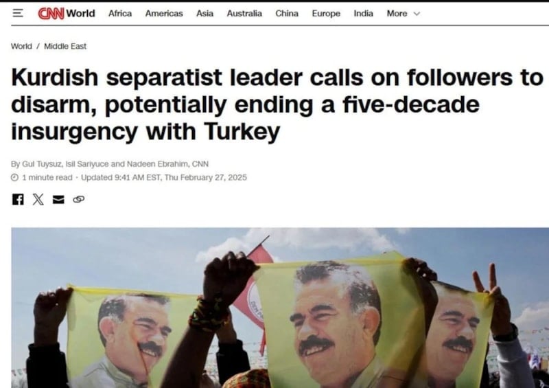 CNN International, "Yapılan açıklamaya göre, Abdullah Öcalan tarihi bir hamleyle partisinden 'silah bırakmasını' ve kendisini feshetmesini istedi" diye yazdı.