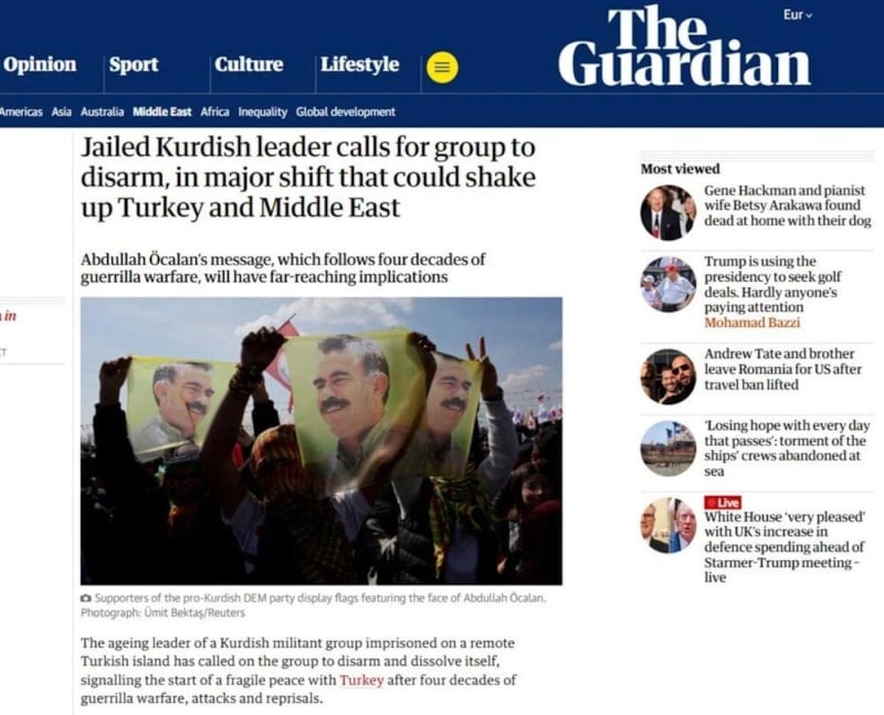 İngiltere'nin önde gelen gazetelerinden The Guardian, hapisteki Öcalan'ın, "Türkiye ve Ortadoğu'yu sarsabilecek büyük bir değişimle, grubun silahsızlanması çağrısında bulunduğunu" yazdı.